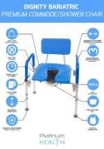 What good is a commode with no access to the perineal area? Virtually every old-style, economy commode sold on the market today has this critical design flaw. For proper cleaning, users require an open, unobstructed front. Users also require a seat base dimension and a “distance between the armrests” dimension that allows for some body movement. Almost all commodes available today ARE TOO SMALL. Only the Dignity Premium Bariatric 3-in-1 Commode addresses all of these issues and more. Designed for users who value quality, safety, comfort, and convenience, the Dignity is the perfect choice for users and caregivers who require a versatile, multi-use chair that can be used in a number of different toileting and bathing scenarios. Unlike old-style, cold, hard plastic seating surfaces, the Dignity is equipped with premium padded, super-comfortable, easy-to-clean seat surface, armrests, and backrest. The adjustable seat height allows the chair to safely accommodate any user. Padded, weight-bearing armrests help make transfers on and off the chair quick and easy. This premium chair can be used as a standalone bedside commode or over a toilet and includes a FREE plastic commode pail. IT IS ALSO DESIGNED TO BE USED AS A SHOWER CHAIR. The premium foam padding will not absorb water and the robust, heavy-duty aluminum frame will never rust. Platinum Health products are commercial grade. They are used in hospitals, senior living facilities, and home care settings worldwide. Order this PREMIUM 3-in-1 commode/shower chair today to make toileting and bathing easier, safer, and more comfortable than ever.