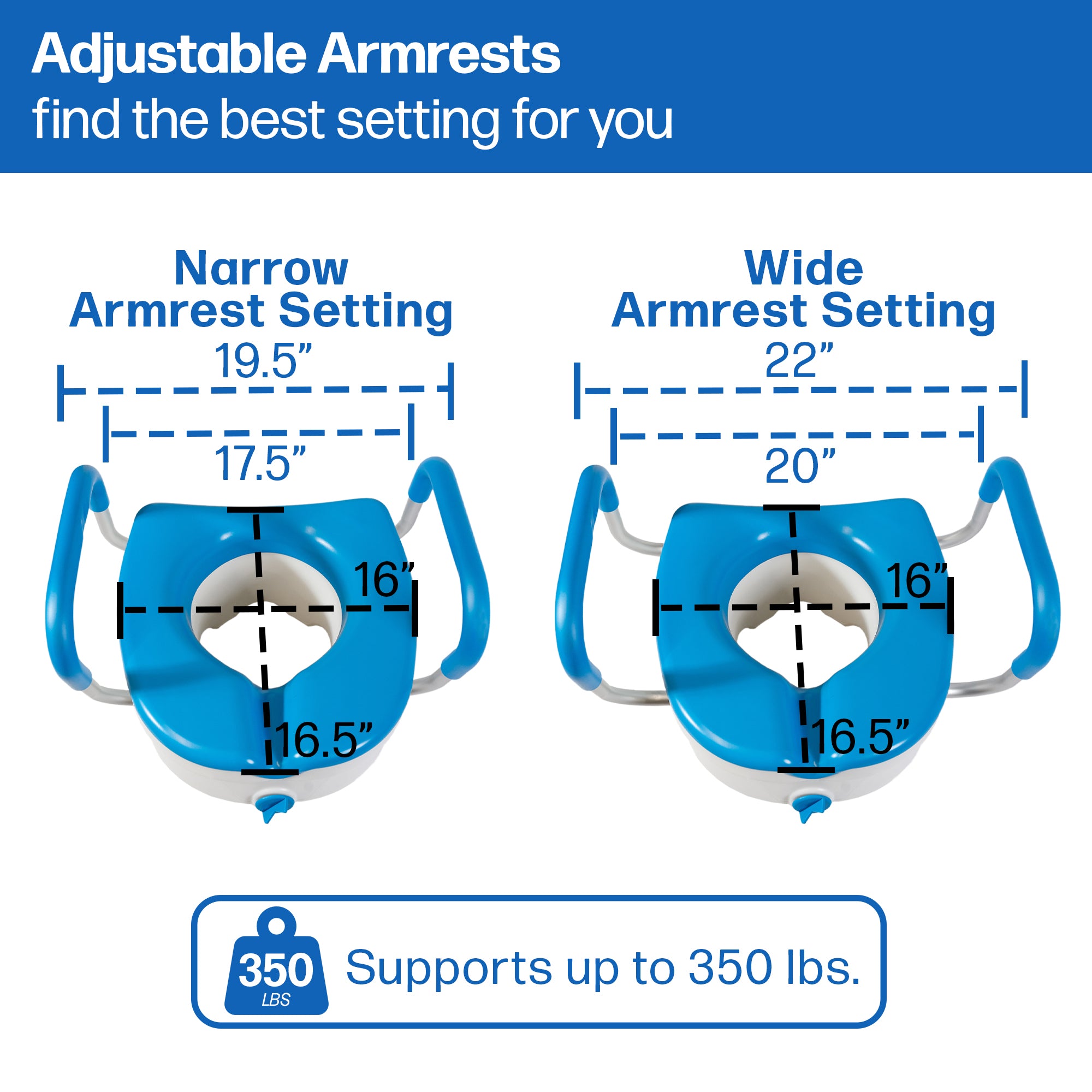 • WIDTHADJUSTABLEPADDED ARMRESTS are weight bearing to provide leverage points for easier sitting and standing. Helps ensure user is properly located on the seat and helps reduct the risk of falls from the toilet. Can be widened to safely and comfortably accommodate larger users, unlike old-style seats with fixed armrests that are too close together for many heavier users.